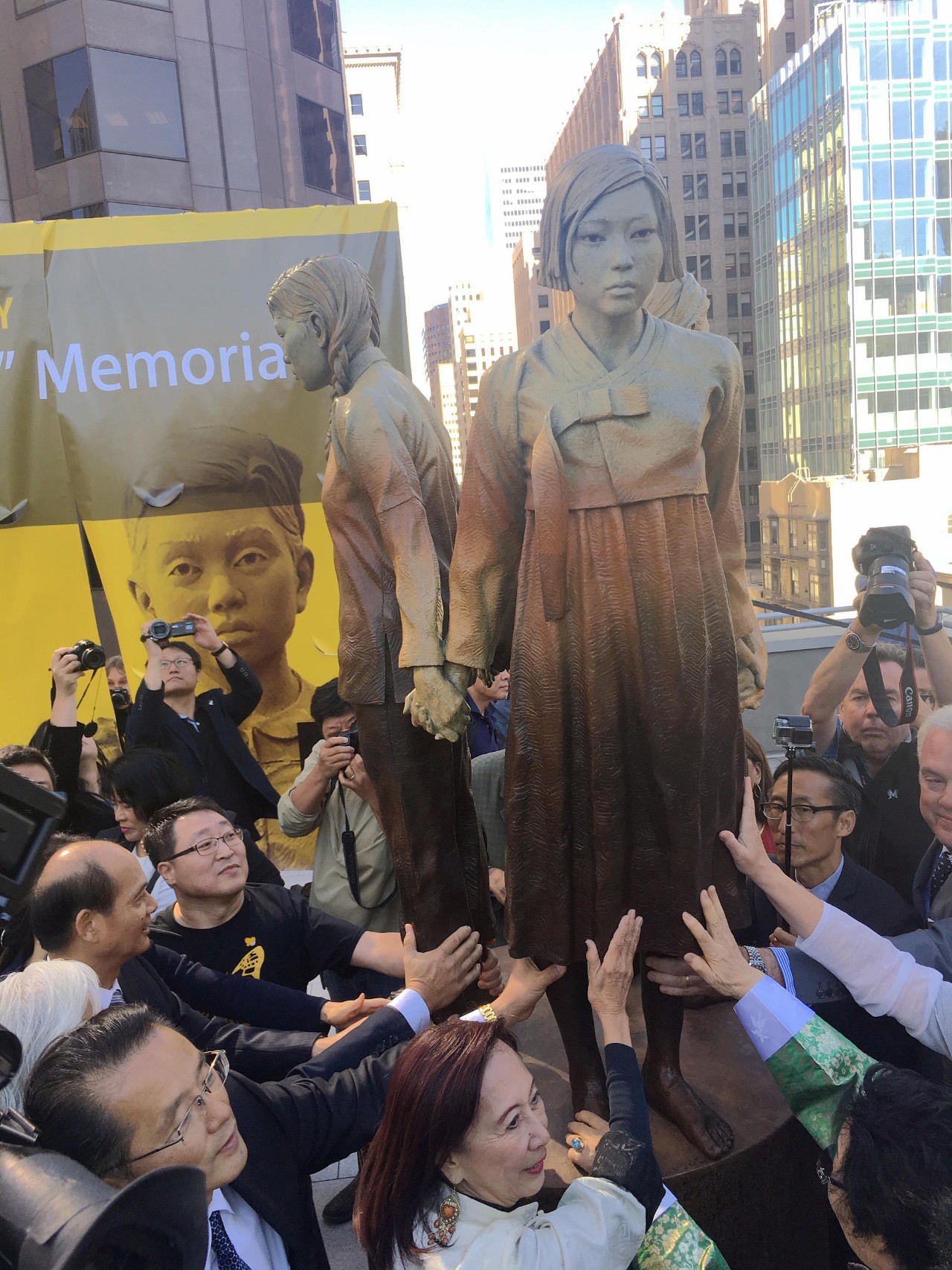 2017年9月22日,韩国、中国、菲律宾“慰安妇”受害者群雕在旧金山圣玛丽广场落成,警醒世人牢记日本侵略者带来的灾难,珍惜和平生活。然而就是这样的一座象征着珍惜和平的群雕,却在日美之间,掀起了不小的外交风波。