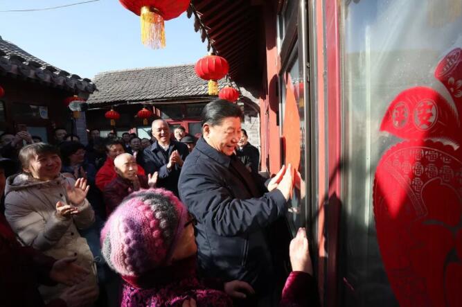 看到总书记到来,大家都很激动,纷纷向总书记问好。居民侯雅明现场写下一副春联,给总书记拜年。习近平高兴地拿起一幅“福”字,亲自贴到门上,给这里的老街坊们拜年。