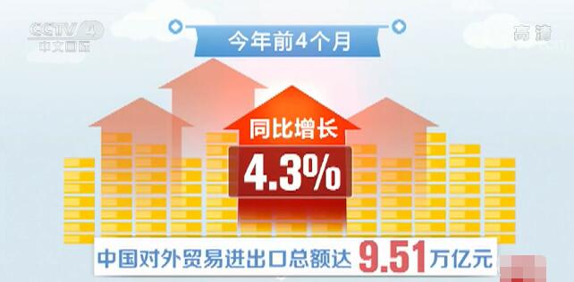 最新公布的数据显示,今年前4个月,中国对外贸易进出口总额达9.51万亿元,同比增长4.3%,表现稳健。