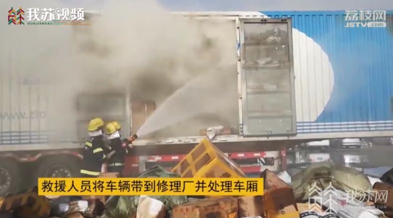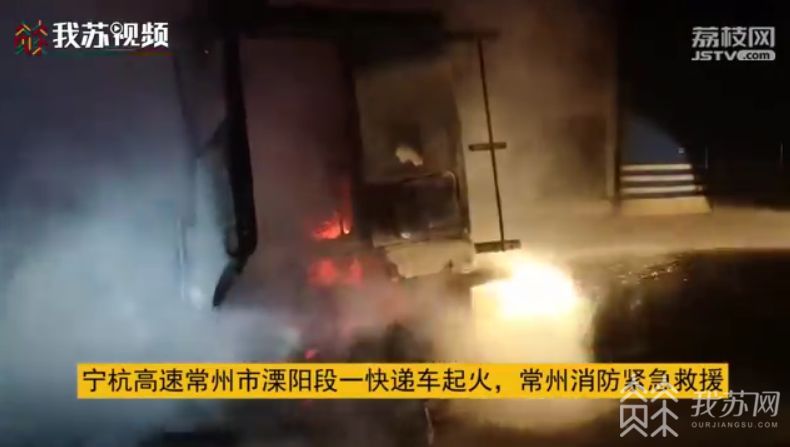 常州溧阳消防部门得到消息后第一时间到达现场发现快递货车车头正迅猛燃烧同时车厢内部冒烟