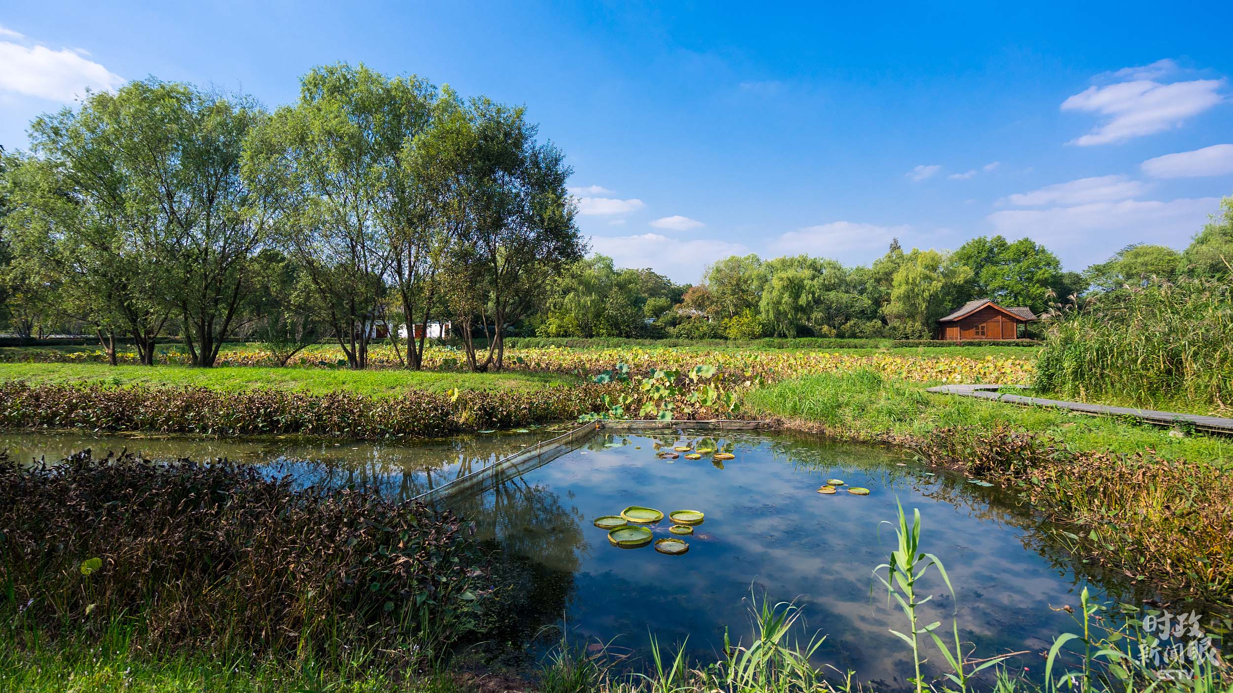 △西溪湿地内约68%面积为河港、池塘、湖漾、沼泽等水域,水体库容量约500万立方米,有“万塘揽胜”之称。(总台央视记者钟锐、李辉拍摄)