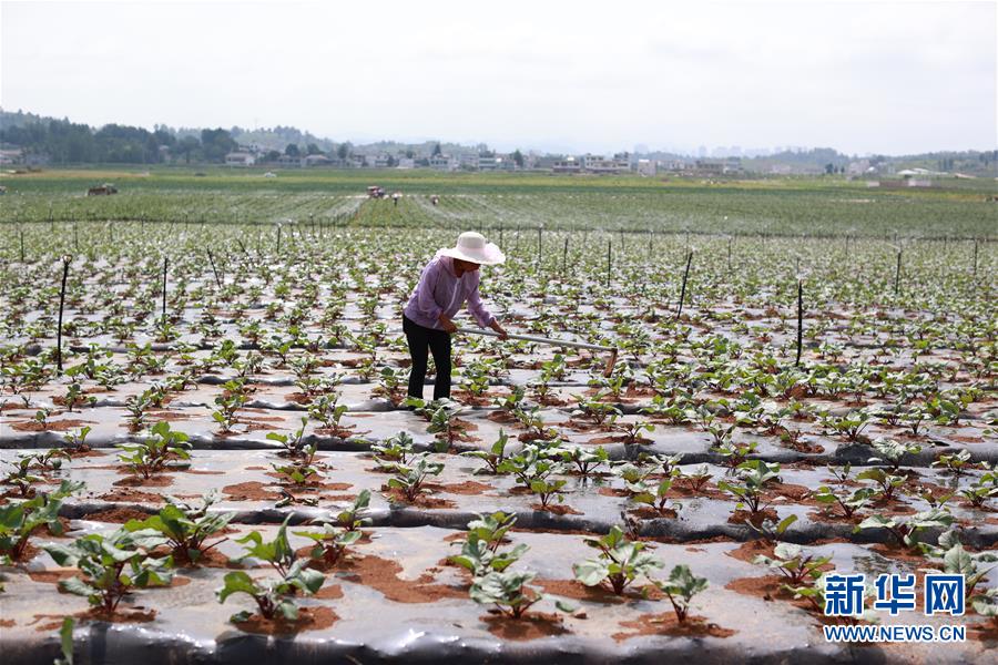 村民在贵州省长顺县代化镇代化社区打傍蔬菜基地内工作(8月2日摄)。新华社记者 刘续 摄