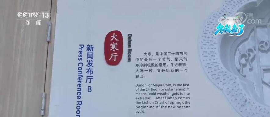 大家看到没有,在主媒体新闻中心的很多中国元素,不仅仅体现在一些恢弘大气的装饰上,还体现在这种细节,比如说这个新闻发布厅,它的名字叫大寒厅,是用咱们的24节气来命名的。当然光有中文还不够,还需要用英文来解释,让更多的外国记者了解到大寒的来源。我们看看旁边的厅是什么,我相信肯定也是24节气中的一个,你看,这个就叫惊蛰厅,另外叫冬至厅,非常有意思。