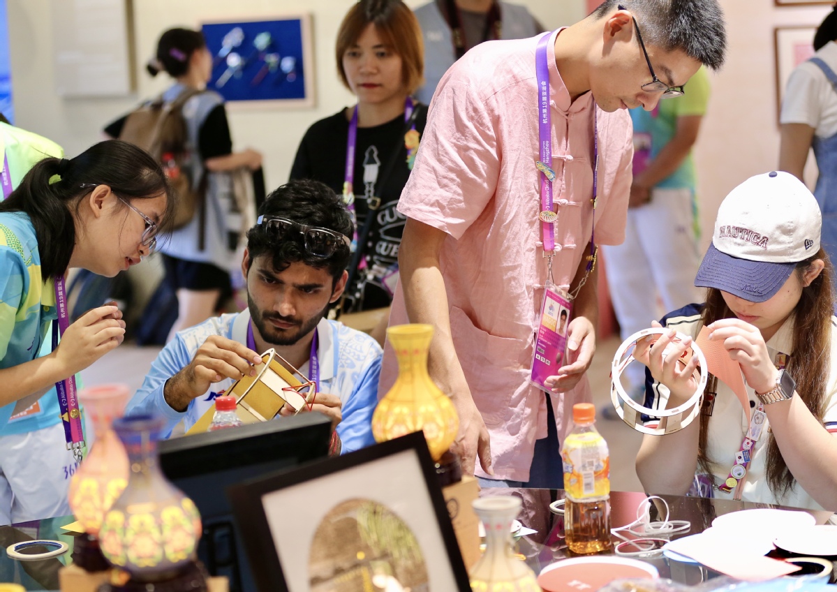 9月29日,中国香港运动员朱咏翘(右一),印度运动员希瓦·纳尔瓦尔(左二)制作硖石灯彩。中国日报记者 张威 摄