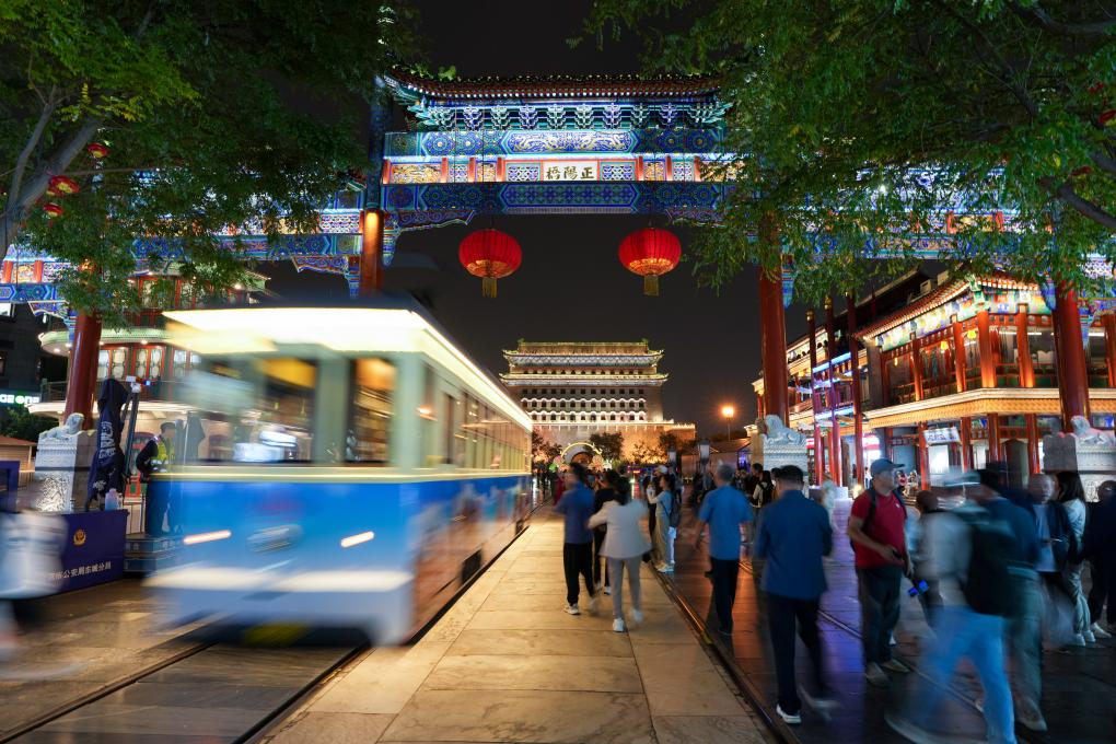 为迎接新中国成立75周年,北京点亮中轴线上的地标建筑。游客在前门大街和正阳门箭楼前参观游览。新华社记者 鞠焕宗 摄
