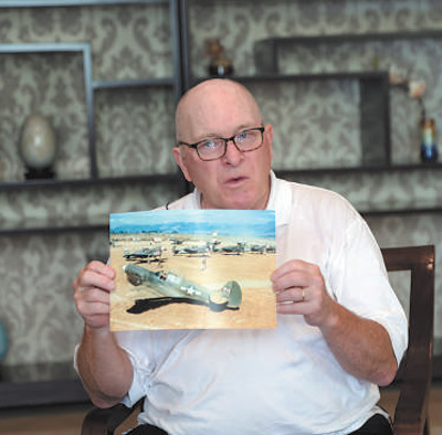 小克利福德·隆展示其父亲曾驾驶的战斗机照片。