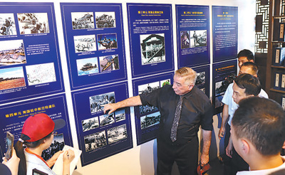 格林(左二)在长汀举办的飞虎队主题历史图片展上讲述历史照片背后的故事。