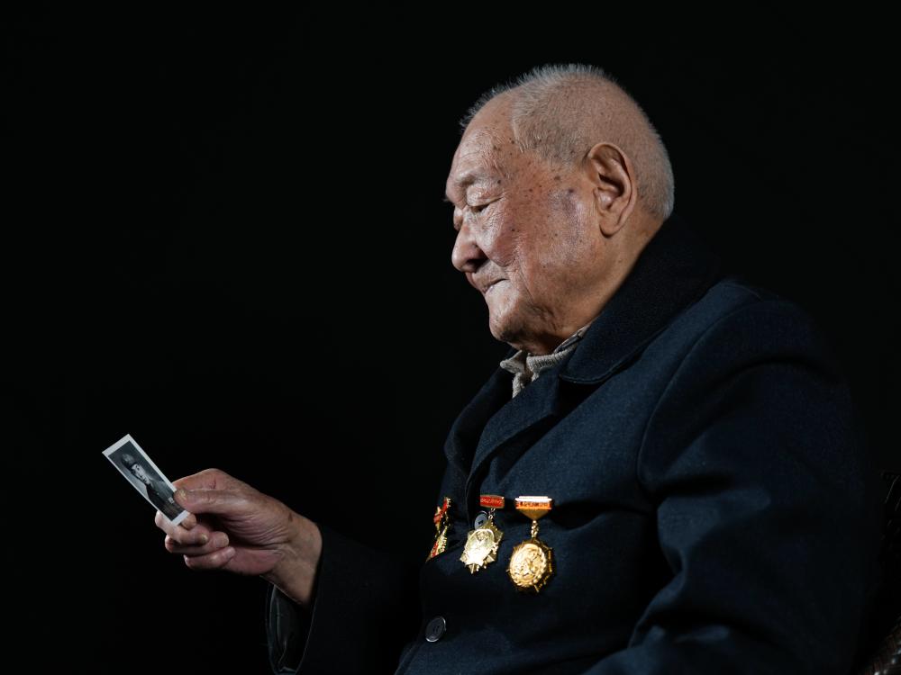 ↑刘寿山端详自己年轻时的军装照(4月9日摄)。