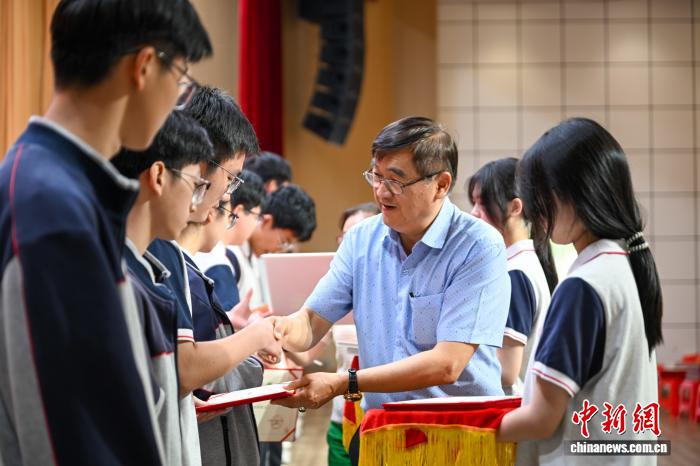 吴发彬为优秀学生发放奖学金。台州台办供图