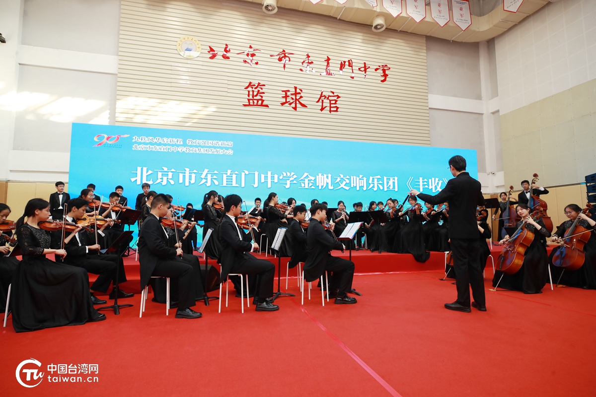 学校金帆交响乐团奏响激昂欢快的《丰收》乐曲,悠扬的旋律为大会拉开帷幕。(中国台湾网发)