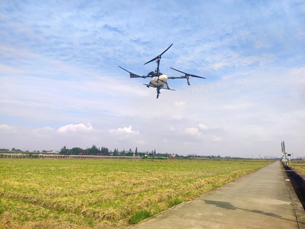 10月14日,在四川省眉山市东坡区永丰村高质量农田里,植保无人机在田内作业。新华网 李然 摄