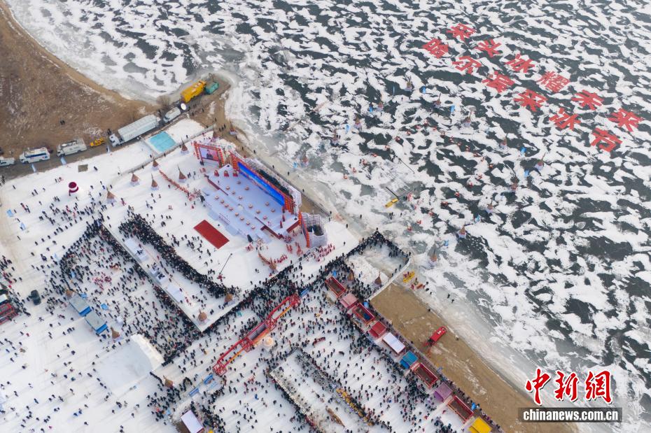 12月7日,第六届哈尔滨采冰节在松花江北岸沙滩部落启幕。在活动当天,采冰人身着传统服饰,在封冻的松花江上取晶莹剔透的“头冰”。此外,在活动现场,游客还可以在冰雪大集市上,品尝江水炖江鱼、大锅煮饺子等特色美食。从此日开始,松花江所采的冰将被送往冰雪大世界,构筑起新一年的冰雪王国。图为活动现场。(无人机照片)