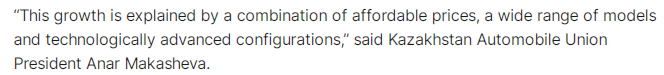文章援引哈萨克斯坦一家汽车及配件贸易网站新车部门负责人亚博·肖姆比诺夫(Yerbol Shombinov)的话表示, “在哈萨克斯坦汽车市场上,中国汽车品牌与许多银行有合作,可以提供相当有竞争力的购车贷款政策”。此外,中国汽车的整车定价也很有优势。肖姆比诺夫表示,“即使在同一级别中,欧洲品牌通常也更贵。中国车型通常更经济实惠,同时提供更多配置让消费者选择。”