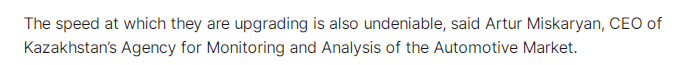 文章称,中国汽车制造商顺应了哈萨克斯坦的国情,积极与当地车企合作,取得了亮眼的成绩。文章以哈萨克斯坦领先的汽车品牌代理、制造和销售企业——阿斯塔纳汽车公司(Astana Motors )为例。该公司是多个中国品牌汽车的哈萨克斯坦代理商。与此同时,该公司积极拓展汽车制造领域业务。文章称,今年9月,阿斯塔纳汽车公司旗下的一家新的CKD工厂(指采用 完全散件进口与本地组装结合模式 的海外生产基地)正式投产,据悉,该工厂能够年产逾12万辆包括多个中国品牌在内的汽车。