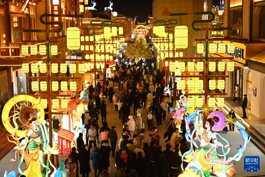 1月1日晚,游客在甘肃省敦煌夜市商业街游览选购特色文创产品。