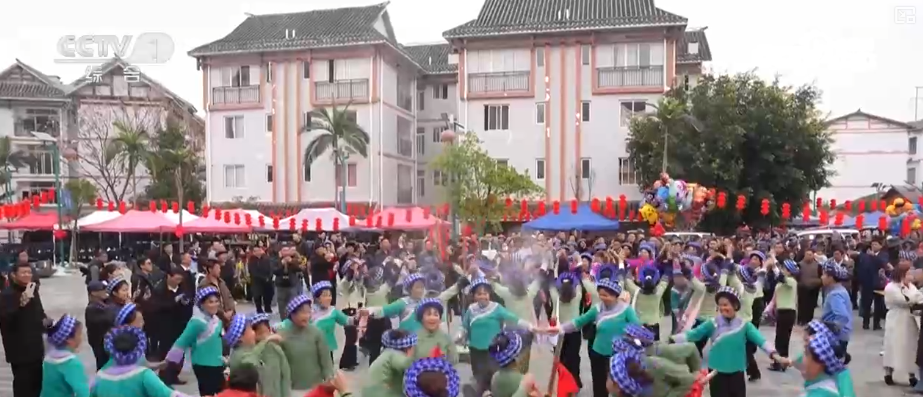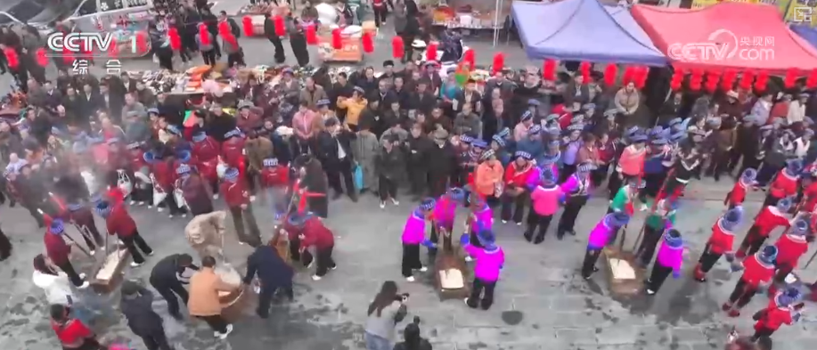 在贵州望谟,各族群众打起糍粑,跳起欢快的舞蹈,礼赞幸福生活,欢度节日。