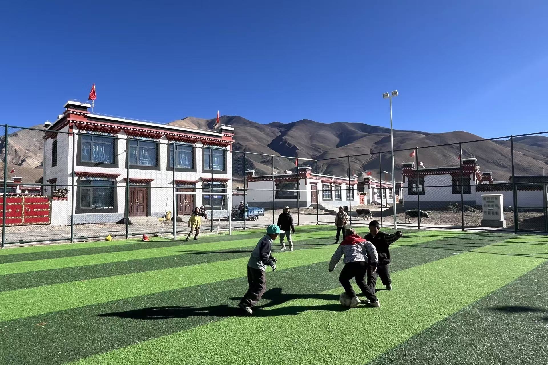 12月26日,灾后重建的长所乡森嘎村,孩子们在人造草坪的足球场上拼抢