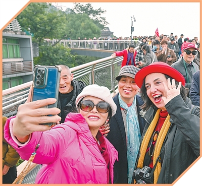 外国游客在重庆半山崖线鹅岭栈桥与市民合影。新华社记者 陈 诚摄