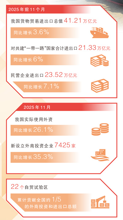 2025年,面对复杂严峻的外部环境,中国外贸逆势而上,实现量稳质升,以稳健的增长展现充沛的活力。2025年前11个月,我国货物贸易进出口总值41.21万亿元,同比增长3.6%。
