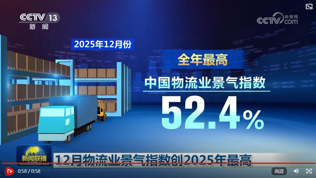 央视网消息(新闻联播):中国物流与采购联合会1月7日公布,2025年12月份中国物流业景气指数为52.4%,环比上升1.5个百分点,景气指数为全年最高。12月份物流业务活动预期指数为54.8%,市场预期持续高位,大宗能源、制造业、民生消费需求带动行业物流总体向好。