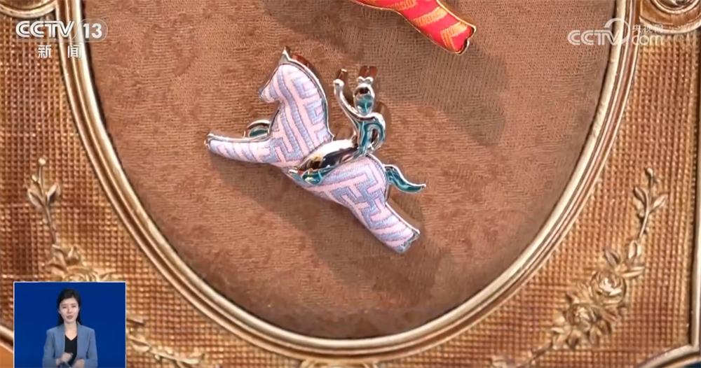 这枚闪耀着金属光泽的胸针,造型策马扬鞭,极具动感,而在马的身体部分选用的则是传统宋锦面料,每只纹样都不尽相同,都是来自对传统纹样的数字化提取和再设计。