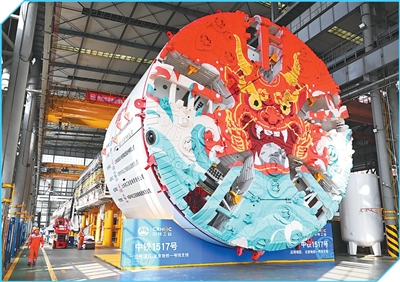 河南郑州,中铁装备集团车间,工人在进行盾构机下线验收工作。