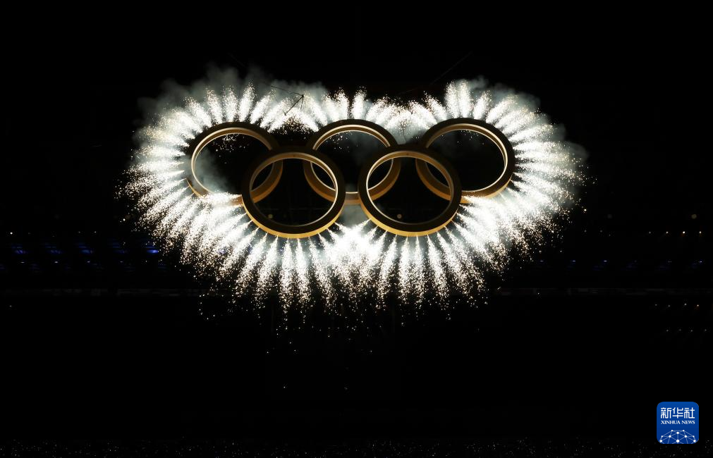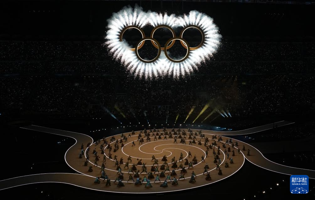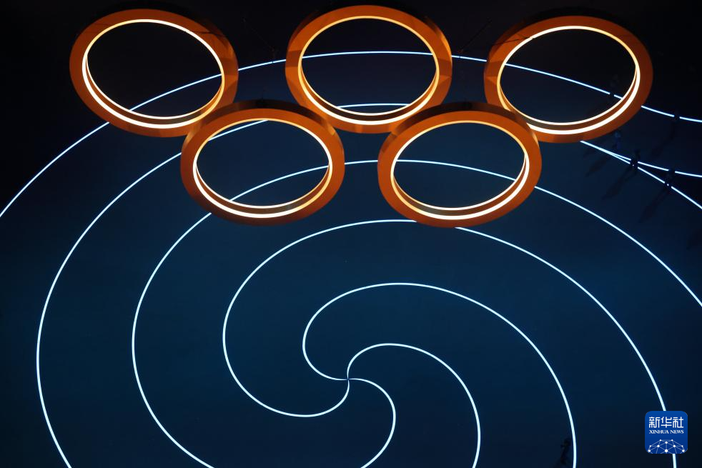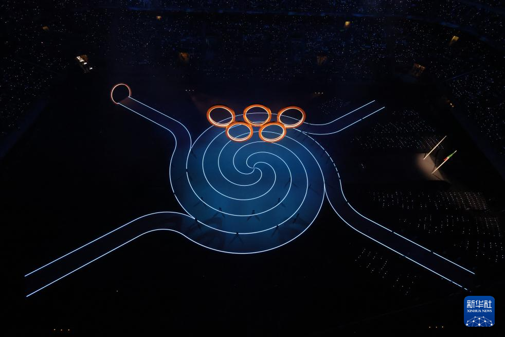 这是2月6日拍摄的开幕式现场的奥运五环。