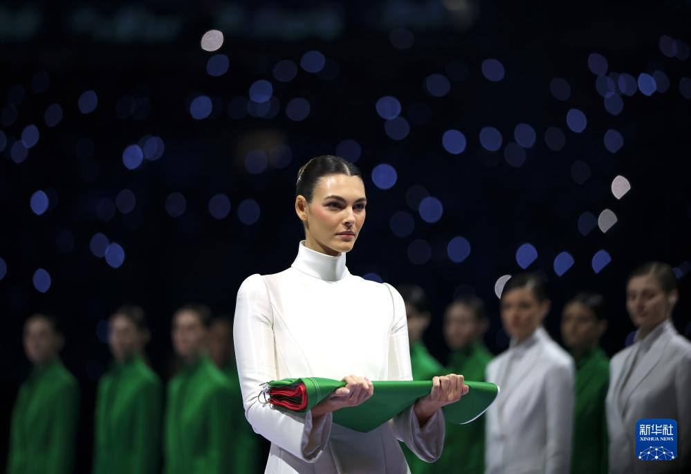 2月6日,模特维多利亚·切蕾蒂在开幕式上手捧意大利国旗入场。