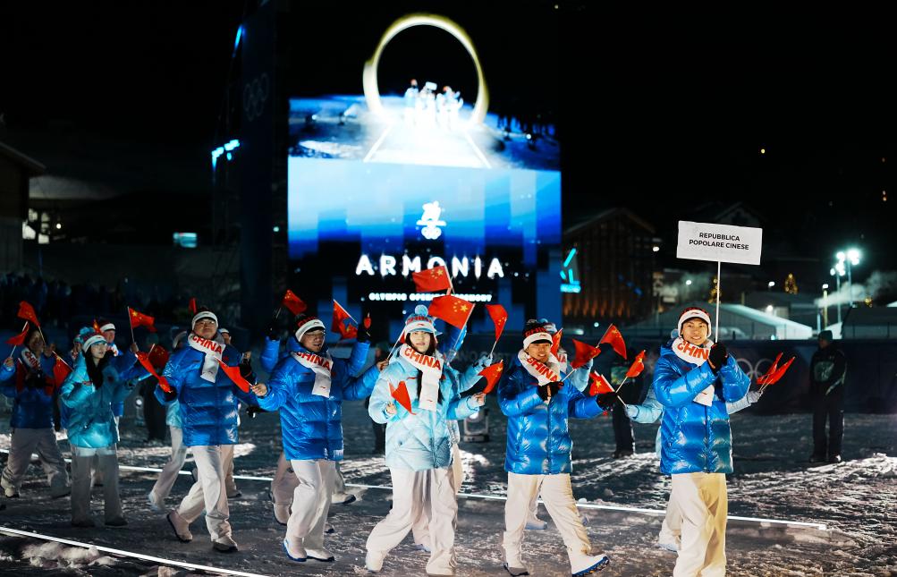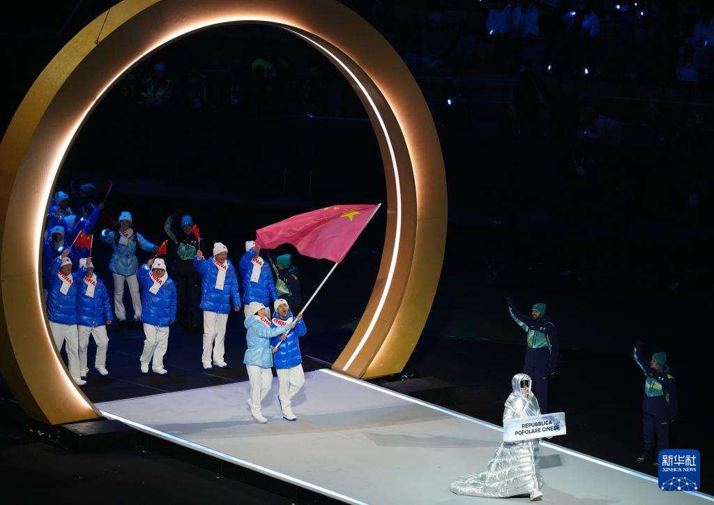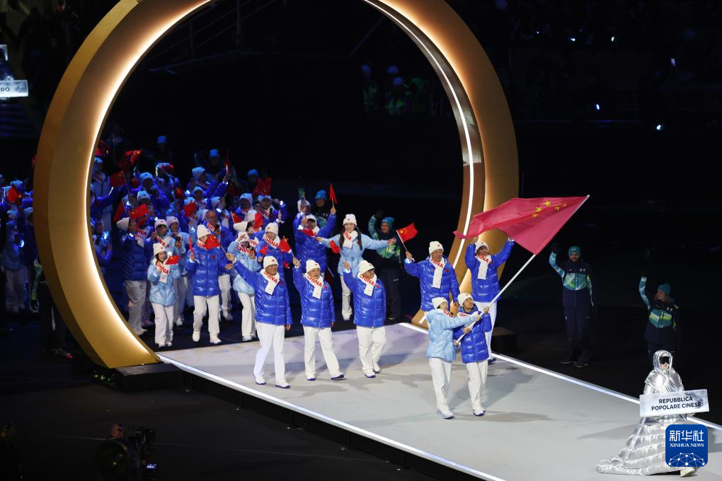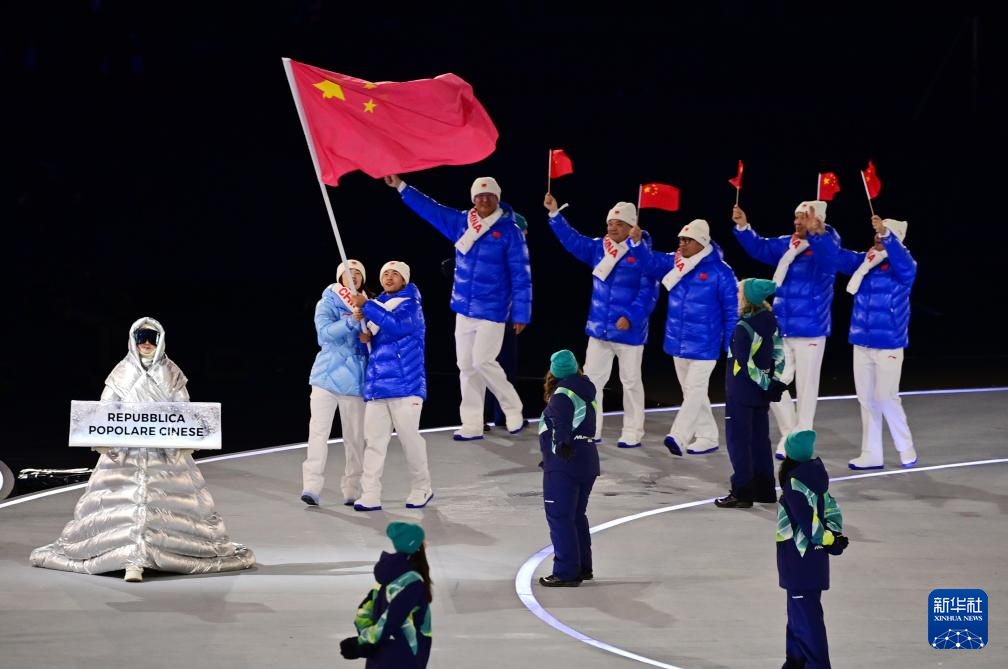 2月6日,中国体育代表团成员在意大利普雷达佐参加入场仪式。
