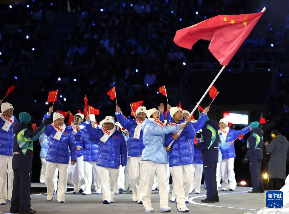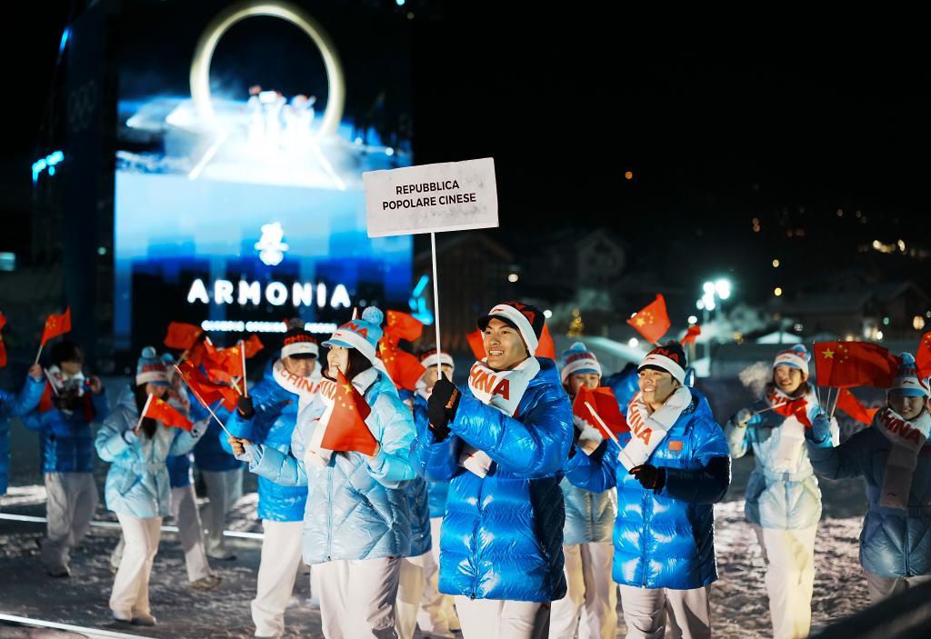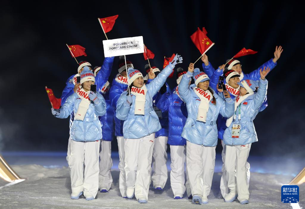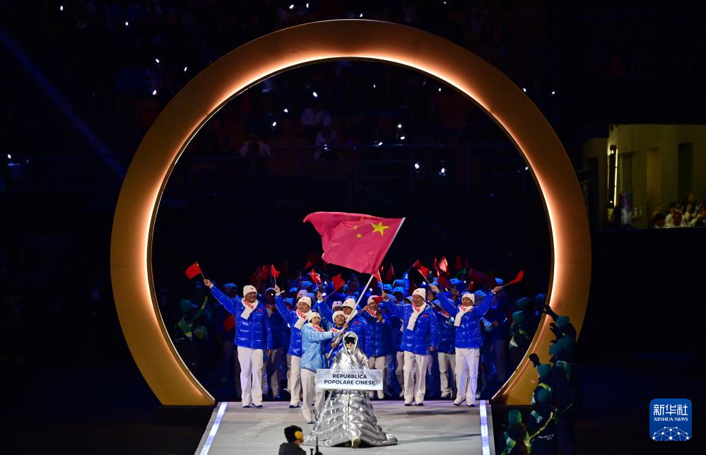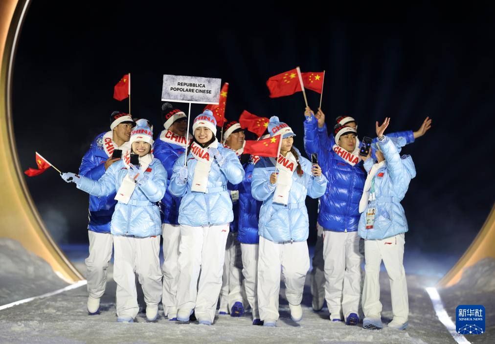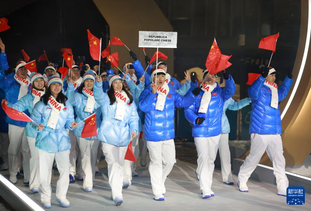 2月6日,中国体育代表团在普雷达佐跳台滑雪中心入场。