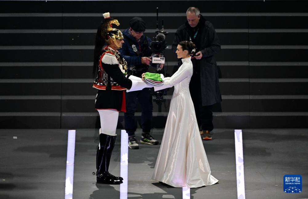 2月6日,模特维多利亚·切蕾蒂(右)和仪仗队成员在开幕式上交接意大利国旗。