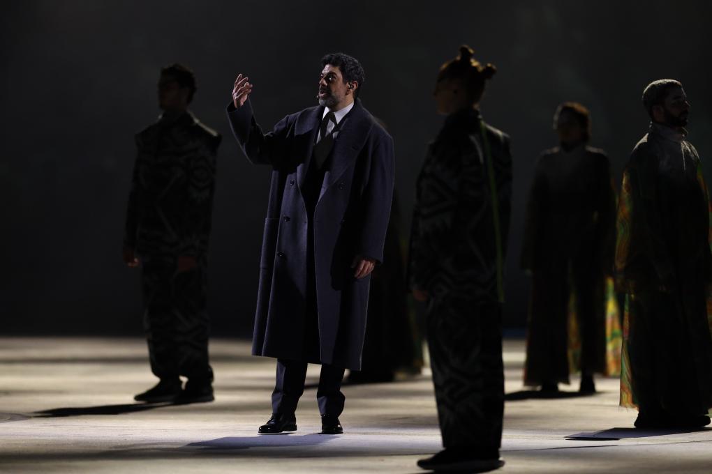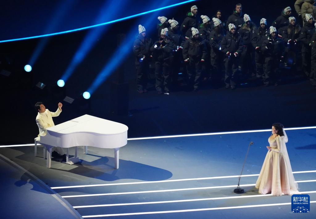2月6日,中国钢琴家郎朗(左)和意大利歌唱家巴托莉在开幕式现场表演。