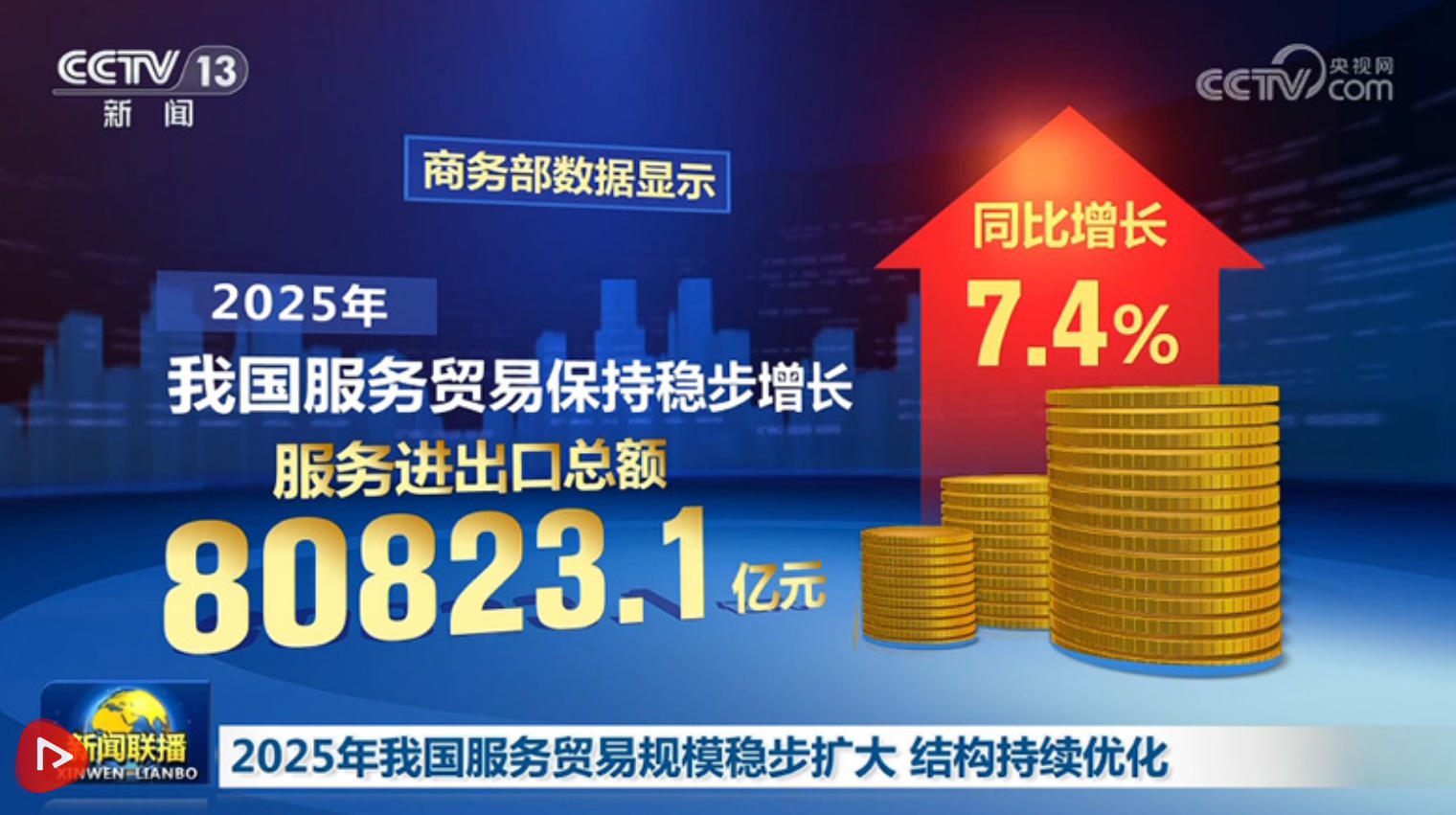央视网消息(新闻联播):2025年,我国服务贸易保持稳步增长,服务进出口总额同比增长7.4%,服务贸易结构持续优化。