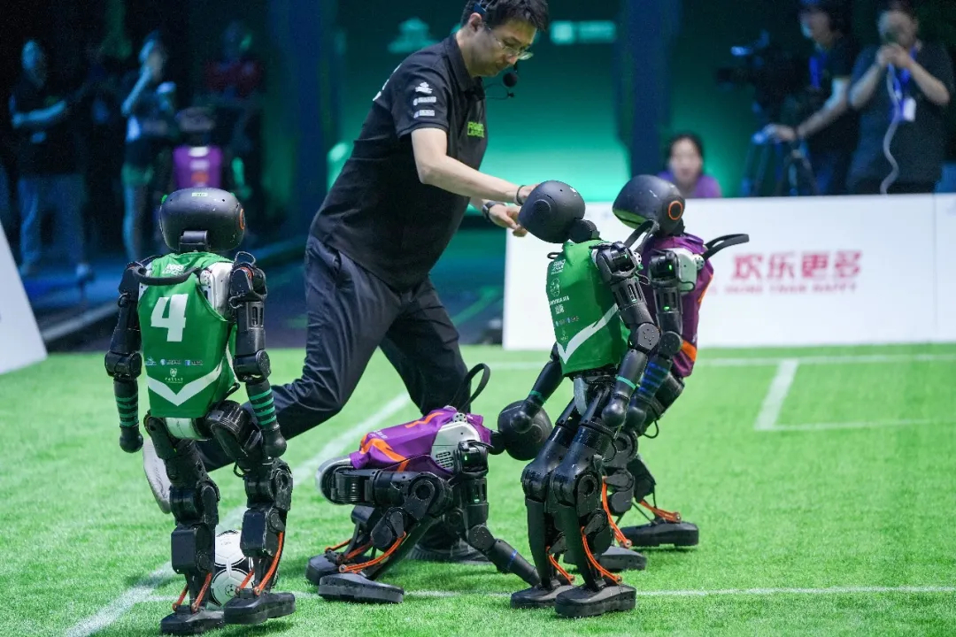 2025年6月28日,在北京举行的中国首场机器人足球3V3 AI赛总决赛中,清华大学火神队5比3战胜中国农业大学山海队获得冠军。图为裁判介入调整机器人。 中新社记者 张祥毅 摄