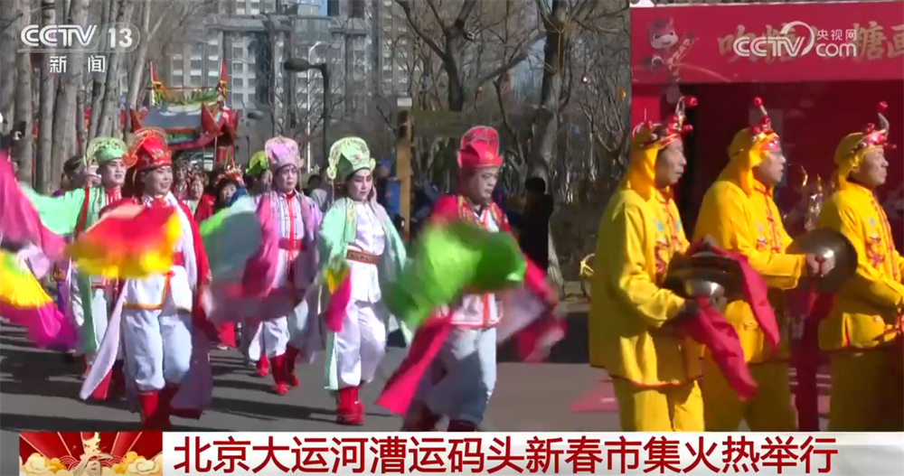 吹糖人、画糖画,在北京通州区大运河文化旅游景区,一场融合千年漕运文脉、地道京味年俗与现代消费体验的新春供销集市正热闹举行。火红的春联福字、喜庆的灯笼以及北京通州区非遗项目民间“小车会”的现场展演,共同构成了当代的“漕运繁盛图”。