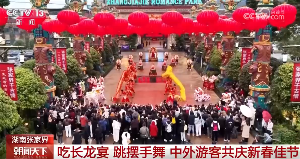 春节期间,湖南张家界千古情景区内张灯结彩,游客与土家族儿女共聚一堂,在浓郁的民俗风情中感受年味儿。