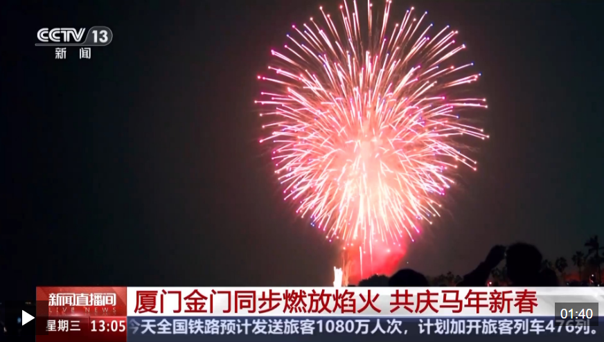 总台记者 陈庚:海峡潮涌,焰火传情。在厦门市思明区黄厝海滩附近,一簇簇焰火腾空而起、热烈绽放,与海对面金门上空的焰火交相辉映,将马年的奋进气韵与两岸同胞情谊融入璀璨光影,绘就春满两岸的美好画卷。