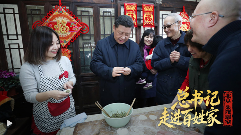 2019年春节前夕,习近平总书记走进北京市东城区草厂四条胡同。在居民朱茂锦家里,总书记与他们一家边包水饺边聊家常。总书记笑着说:“我家里也爱包茴香馅的。多年来因工作关系我没包过饺子了,你们看,越包越好。我们的生活也是这样,越过越好!”