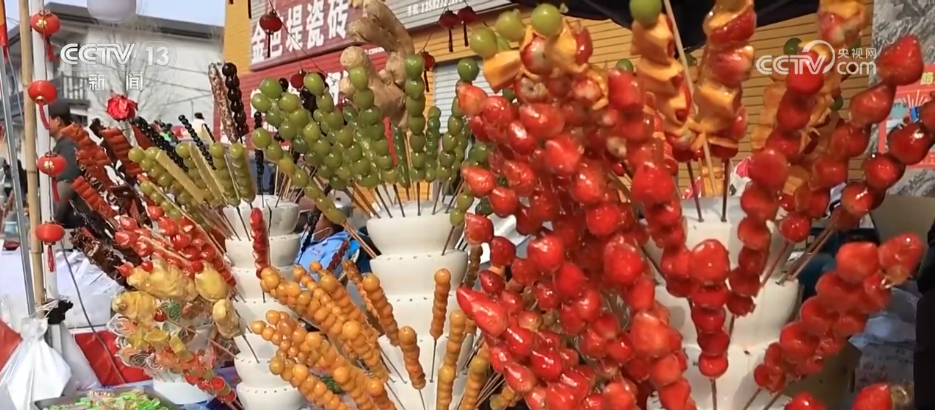 临近元宵节,在河北沧州任丘市吕公堡镇的“糖墩庙会”上,摩肩接踵、人头攒动,摊位一个接一个挤满整条街。除了传统的山楂、山药口味,在这里,西红柿、葡萄、草莓、柚子,甚至柿子椒、辣条也被裹上了亮晶晶的糖外衣。这些新奇的口味,吸引不少游客买来尝鲜。
