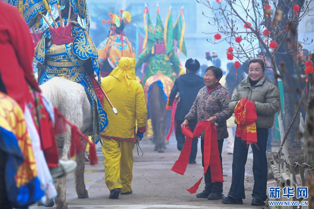 3月2日,陇县黄花峪村村民在路边迎接社火队。新华社记者 邹竞一 摄