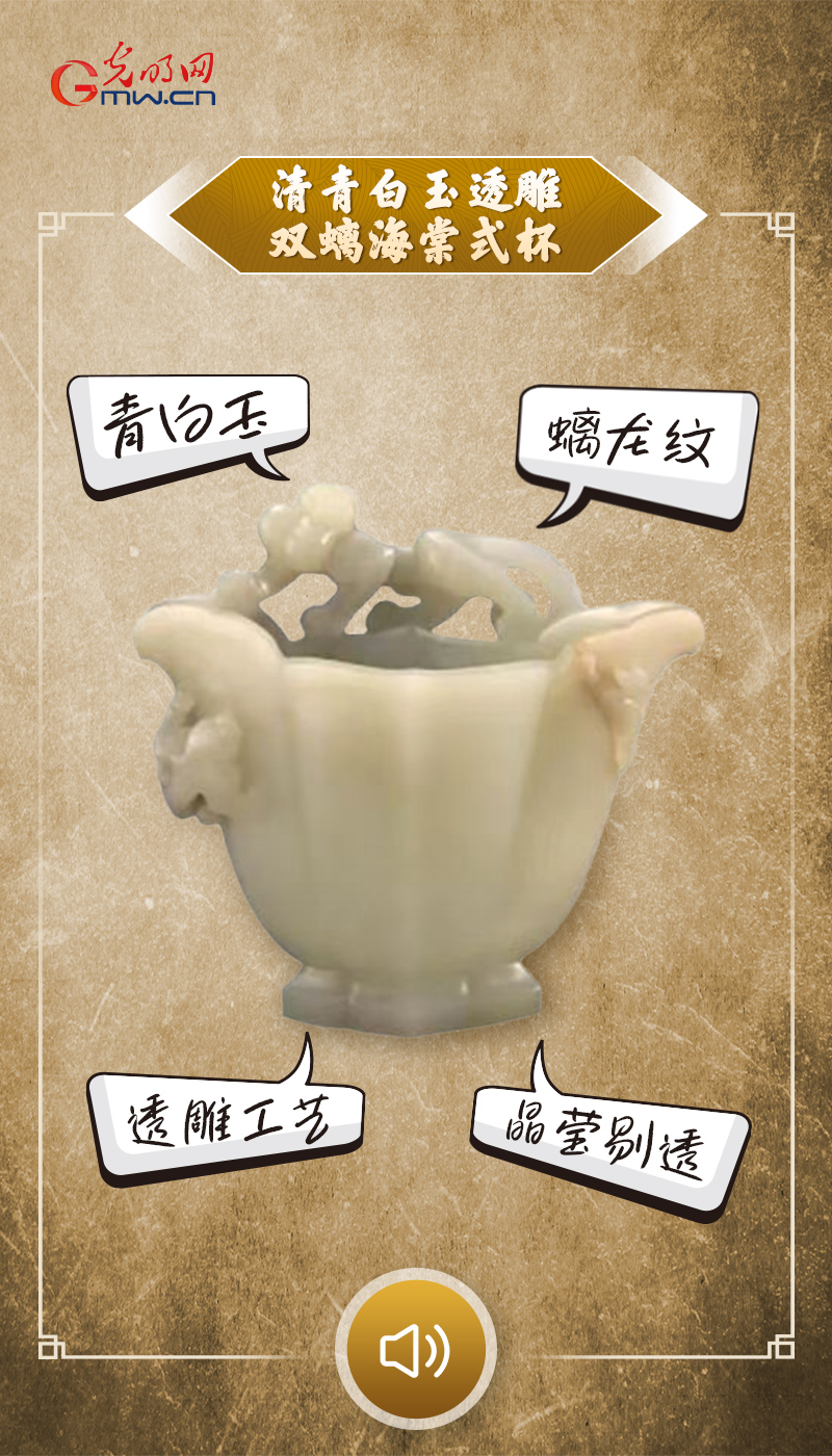 清青白玉透雕双螭海棠式杯现收藏于厦门市博物馆。杯子通高14.6厘米,口长16厘米,底长7.2厘米,弧腹下部内收,圈足,在清代宫廷中作为御用茶具使用。杯体以青白玉雕琢而成,呈淡淡的奶白色,带有温润光泽,造型为四出海棠式,近菱形,边缘圆润柔和。器身采用透雕工艺,杯沿圆雕一螭龙,杯侧浮雕一螭龙,螭龙身形如虎,为螭与虎的复合体,秦汉时期最为流行。螭为阴代表地,虎为阳代表天,螭虎神兽意指天地合,阴阳接。同时,螭虎也常用来比喻勇猛的将士。