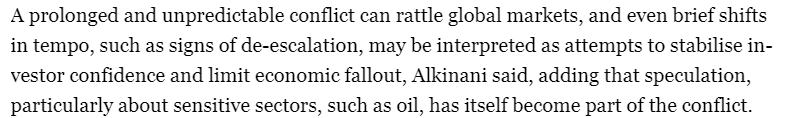 一名研究中东地区的金融分析师泽顿·阿尔基纳尼(Zeidon Alkinani)告诉半岛电视台,旷日持久且难以预测的冲突会动摇全球金融市场的信心,即使是短暂的节奏变化,例如局势缓和的迹象,也可能被解读为试图稳定投资者信心和限制经济损失。阿尔基纳尼强调,“投机行为,特别是对石油等敏感行业的投机行为,本身也已成为冲突的一部分。”