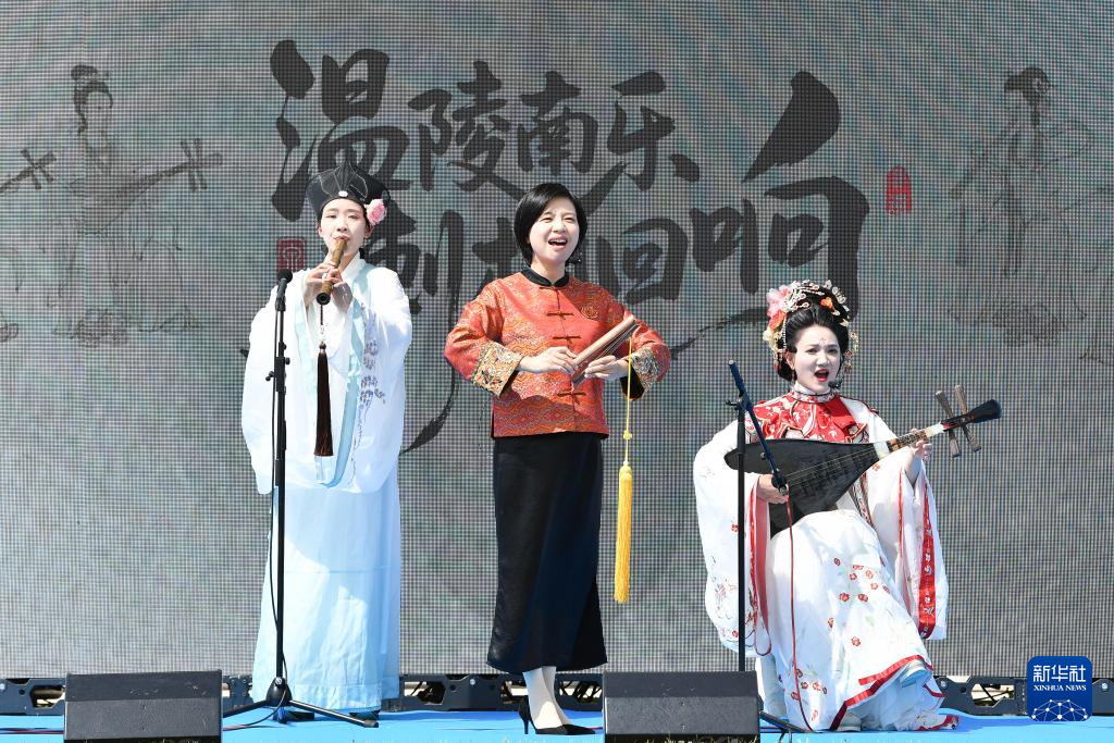 4月17日,在瑞士日内瓦万国宫,来自中国泉州的表演者在表演南音《三千两金》。