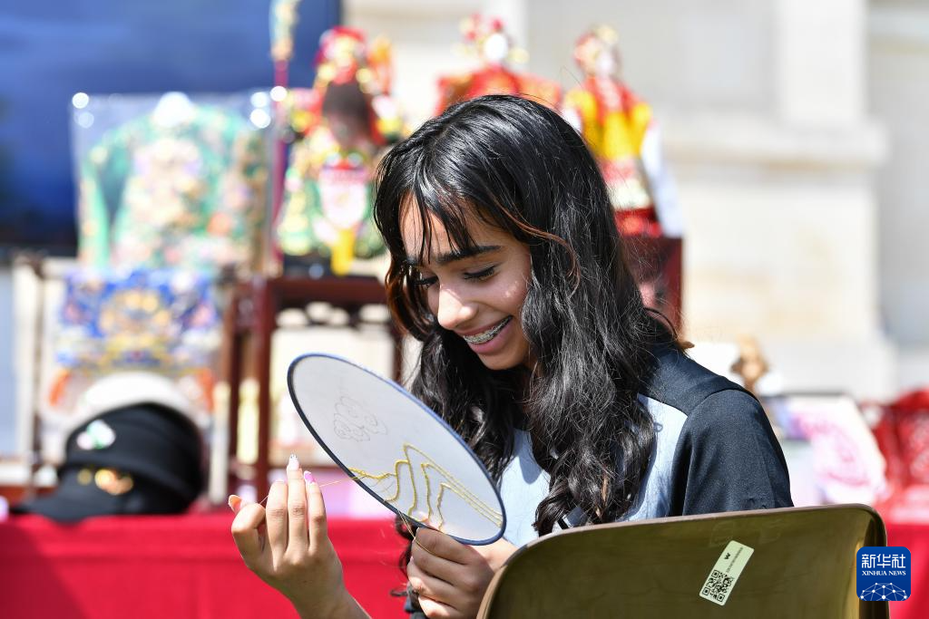 4月17日,在瑞士日内瓦万国宫,来自巴基斯坦的小朋友在体验泉州金苍绣。