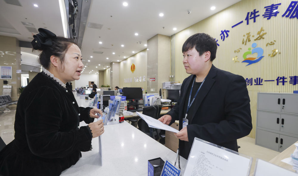 2026年4月9日,在江苏淮安经济技术开发区政务服务中心,市民(左)向工作人员咨询营业执照经营范围、办理流程等信息。新华社发(赵启瑞摄)