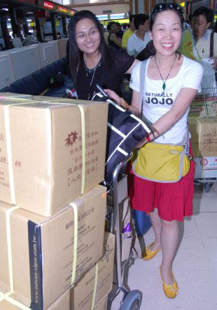 今天傍晚,搭乘东方航空南京—松山的苏州首发团100多人,把松山机场代理地勤业务的立荣航空报到柜台挤得水泄不通,几乎每个人都有包装好的大纸箱,塞满了在台湾购买的纪念品、拌手礼,托运回家。