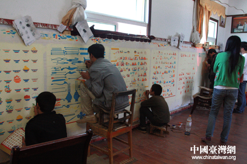 热贡画院办公室主任龙措向记者们介绍唐卡的制作。(中国台湾网 杨云涛摄)