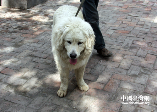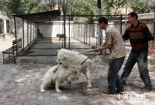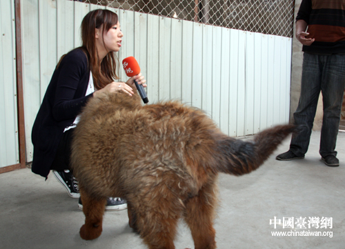 台湾记者与藏獒零距离接触。(中国台湾网 杨云涛摄)