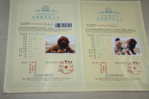 藏獒血统鉴定书。(中国台湾网 杨云涛摄)