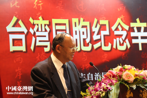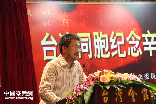 台湾抗日志士亲属协进会顾问、台湾中国统一联盟文宣部长戚嘉林在座谈会上发言。(中国台湾网 杨丽 摄)
